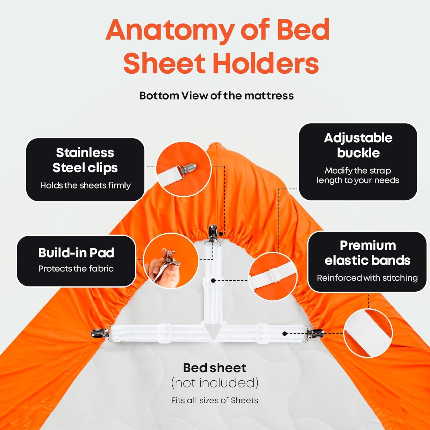 5 STARS UNITED Bed Sheet Straps Set | Easy to Use Adjustable Elastic Fasteners with Metal Clips | Sheet Holders for Corners | Fitted Sheet Clips to Hold Sheets in Place | (8 Pcs White)(White)